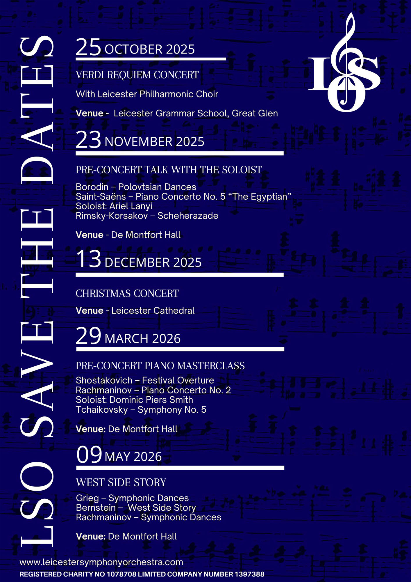 The LSO is a registered charity and relies solely on income from ticket sales, members’ subscriptions, Friends of the LSO, Patrons, and fees from advertisers in the concert programmes, to ensure that the long and fine tradition of music making established by Sir Malcolm Sargent continues. You can assist us this season by buying tickets for our concerts in the De Montfort Hall, by becoming a Friend or Patron, or by advertising in our concert programmes.